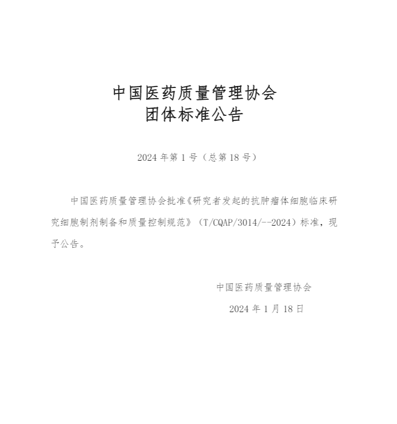 2024年5月1日,由中國醫(yī)藥質(zhì)量管理協(xié)會(huì)發(fā)布的《研究者發(fā)起的抗腫瘤體細(xì)胞臨床研究細(xì)胞制劑制備和質(zhì)量控制規(guī)范》(T/CQAP 3014—2024)標(biāo)準(zhǔn)(以下簡稱“標(biāo)準(zhǔn)”)將正式實(shí)施。
