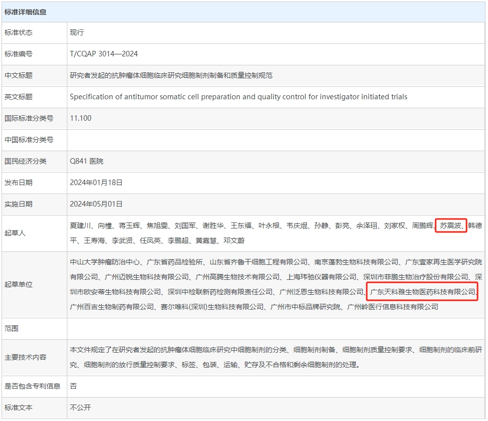 中山大學(xué)腫瘤防治中心主任導(dǎo)師兼中國醫(yī)藥質(zhì)量管理協(xié)會(huì)細(xì)胞治療質(zhì)量控制與研究專業(yè)委員會(huì)主任委員夏建川、實(shí)驗(yàn)研究部副研究員向橦、廣東省藥品檢驗(yàn)所一級主任科員蔣玉輝、廣東天科雅生物醫(yī)藥科技有限公司等參與起草,助力推動(dòng)中國抗腫瘤體細(xì)胞臨床研究。