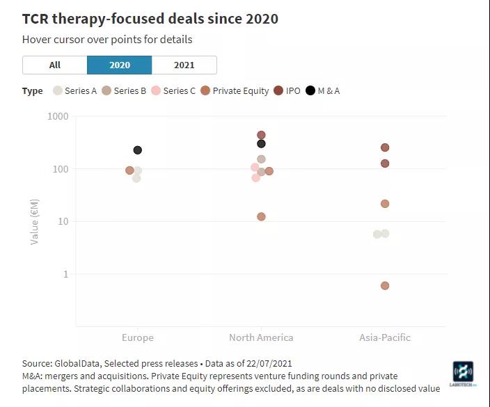 對于開發(fā)工程T細(xì)胞受體(TCR)的癌癥細(xì)胞療法(稱TCR或TCR-T細(xì)胞療法)的公司來說,2020年TCR-T是在全球市場飛速增長最快的一年。在歐洲生物技術(shù)領(lǐng)域中,德國公司Immatics于2020年7月進(jìn)入納斯達(dá)克股票市場。此時德國的T-knife和荷蘭的Neogene分別完成了該領(lǐng)域的A輪融資。