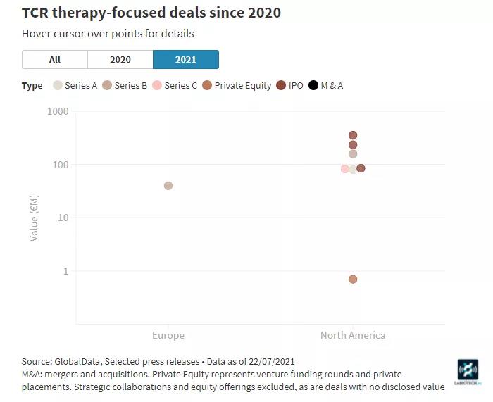 然而在2021年上半年,歐洲卻很少有開發(fā)商對TCR-T進(jìn)行風(fēng)險投資,同樣在亞洲也是如此。但是這一現(xiàn)象與美國形成鮮明對比,美國至少獲得了三輪由TCR-T公司的籌集的風(fēng)險投資,并且TCR-T開發(fā)商在美國也進(jìn)行了多次首次公開募股。最近一次是TScan Therapeutics以8500萬歐元的價格完成資金募集。